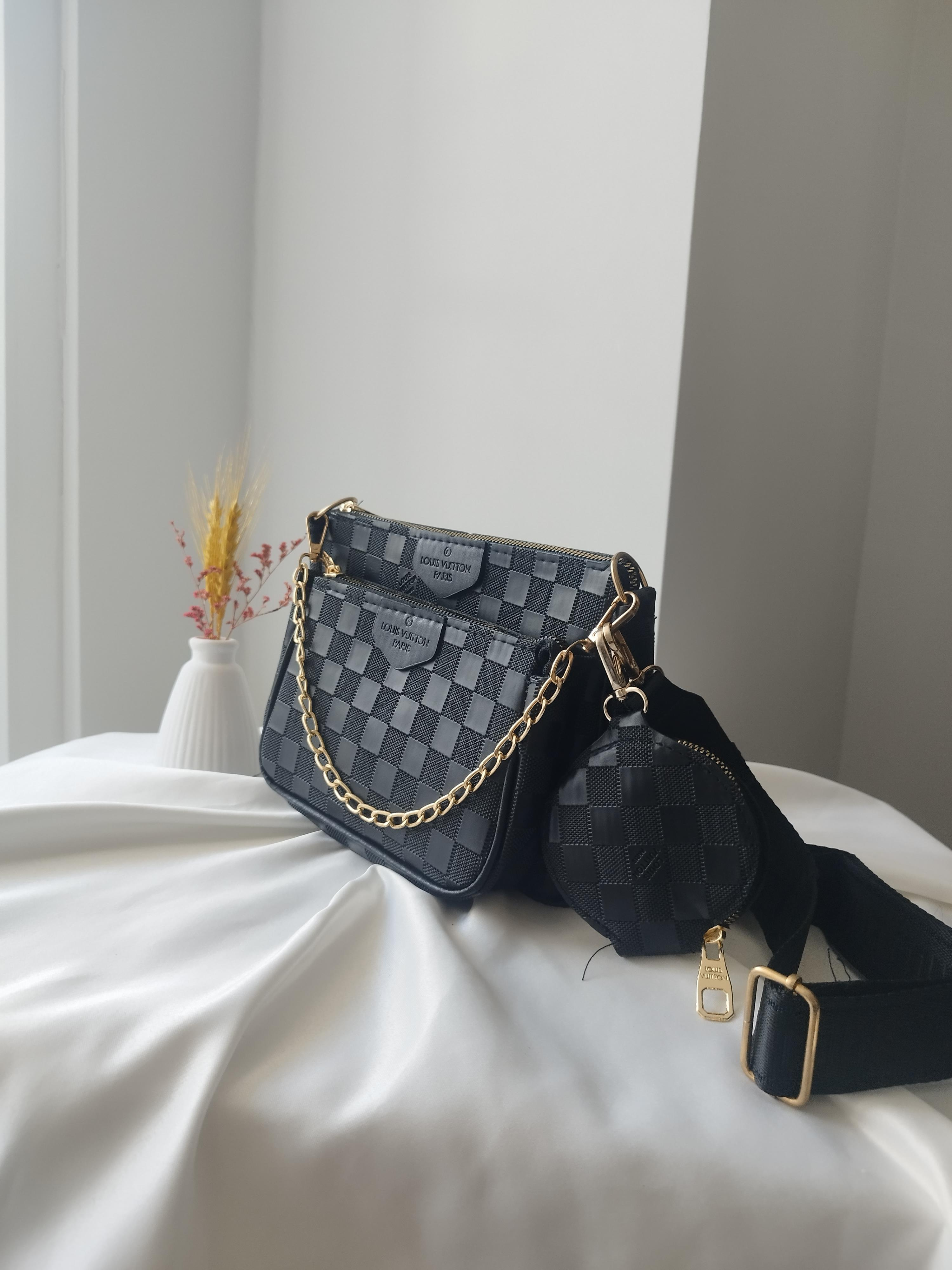 3'lü Model Damalı Deri Omuz Çanta Siyah, modern damalı desen tasarımı ve farklı boyutlardaki çanta seçenekleri ile günlük hayatta, iş yaşamında ve özel günlerde stilinize fonksiyonel bir dokunuş katar. Kaliteli suni deri malzemesi dayanıklı kullanım sağlarken, fermuarlı kapanış sistemi güvenliğinizi artırır. Siyah rengi ile her kombinle kolayca uyum sağlar.