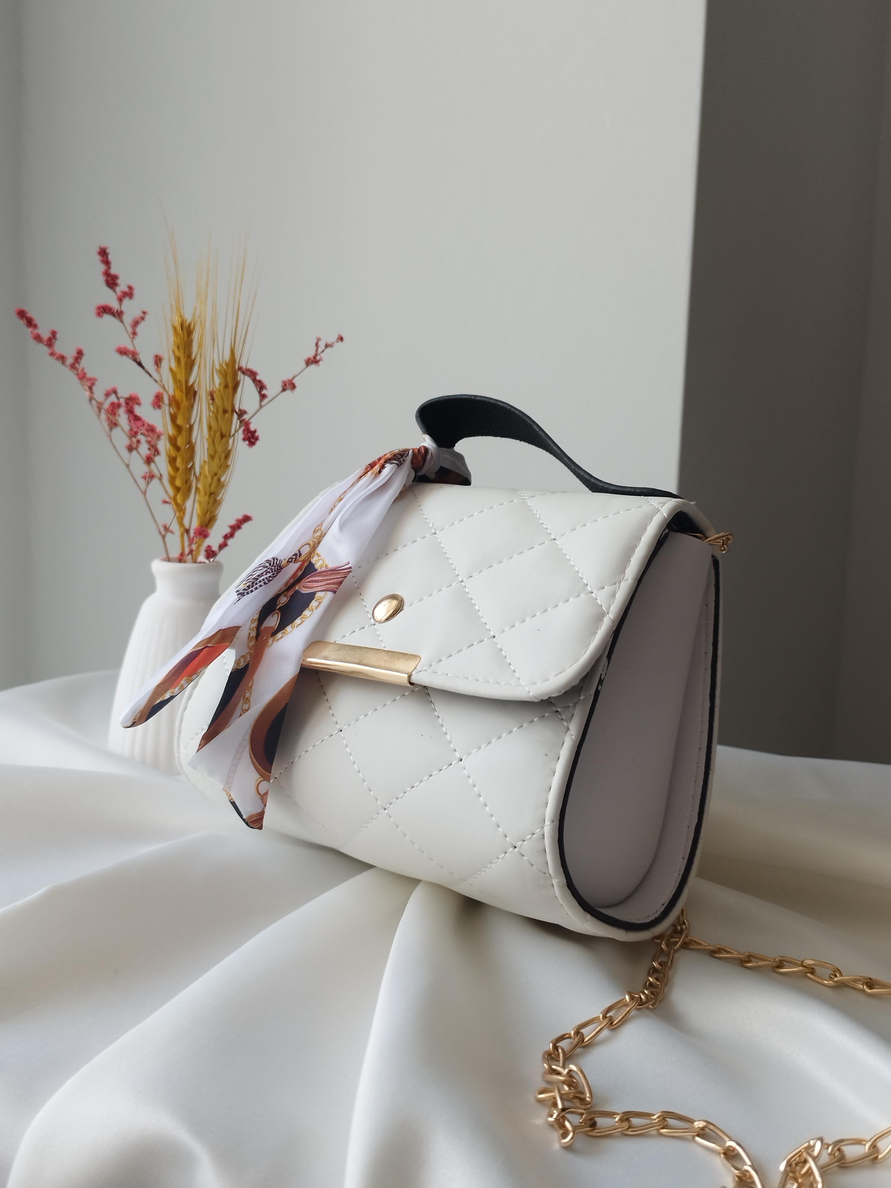 Vivazzaluxe’un fular detaylı beyaz mini kadın el ve omuz çantası, minimalist tasarımıyla modern şıklığın zarif temsilcisi.