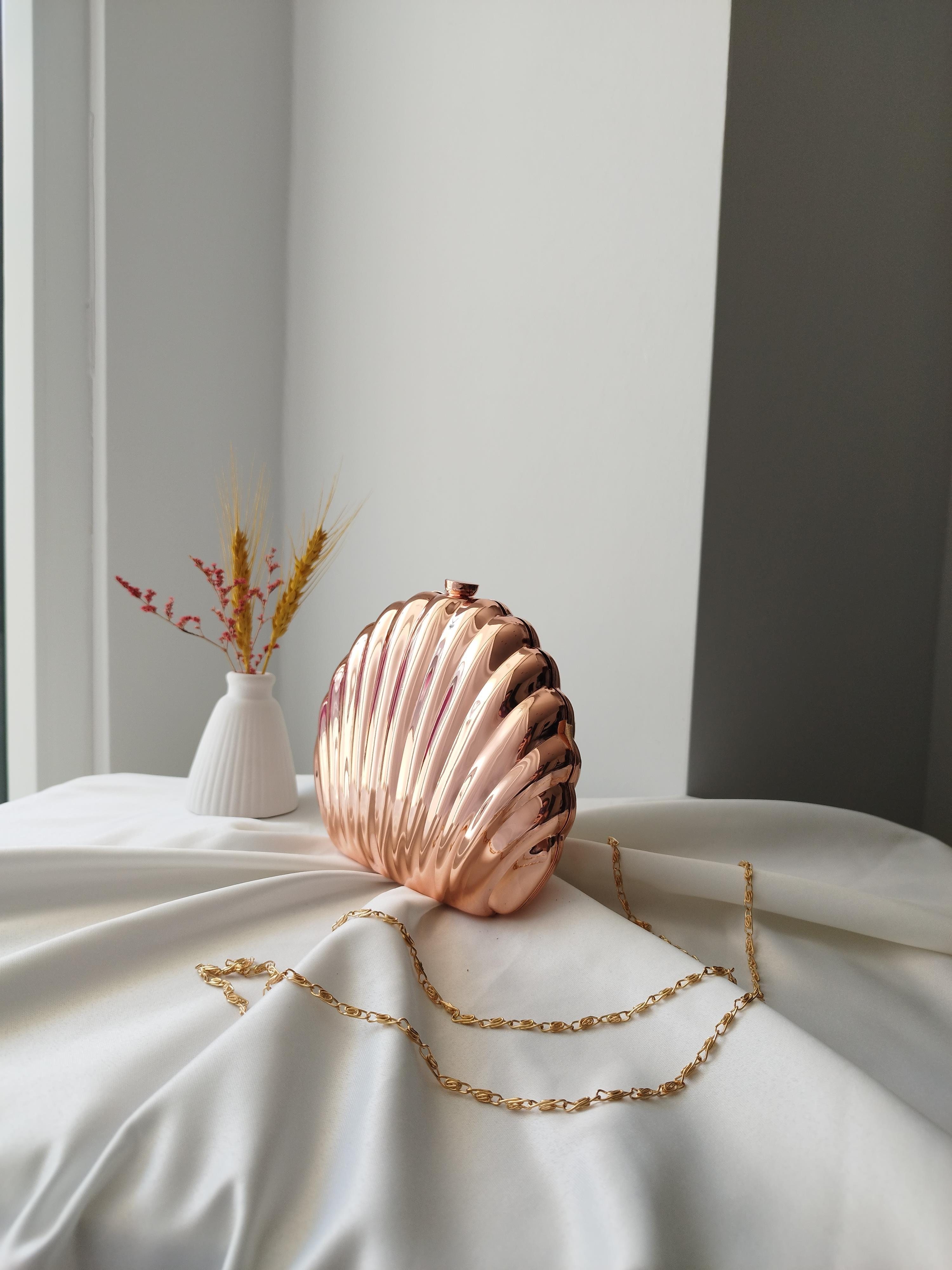 İstiridye Model Kadın Abiye Çanta Rose Altın, deniz kabuğu esintili tasarımı ve rose altın rengin sofistike parlaklığıyla özel günlerinizin vazgeçilmez aksesuarı. Şık istiridye formu sayesinde farklı ve göz alıcı bir tarz sunar. Düğün, nişan, davet ve partilerde kombinlerinizi tamamlayan bu clutch çanta, kompakt yapısıyla telefon, makyaj malzemesi ve küçük kişisel eşyalarınızı taşımanız için idealdir. Modern şıklığıyla stilinizi yükseltir.