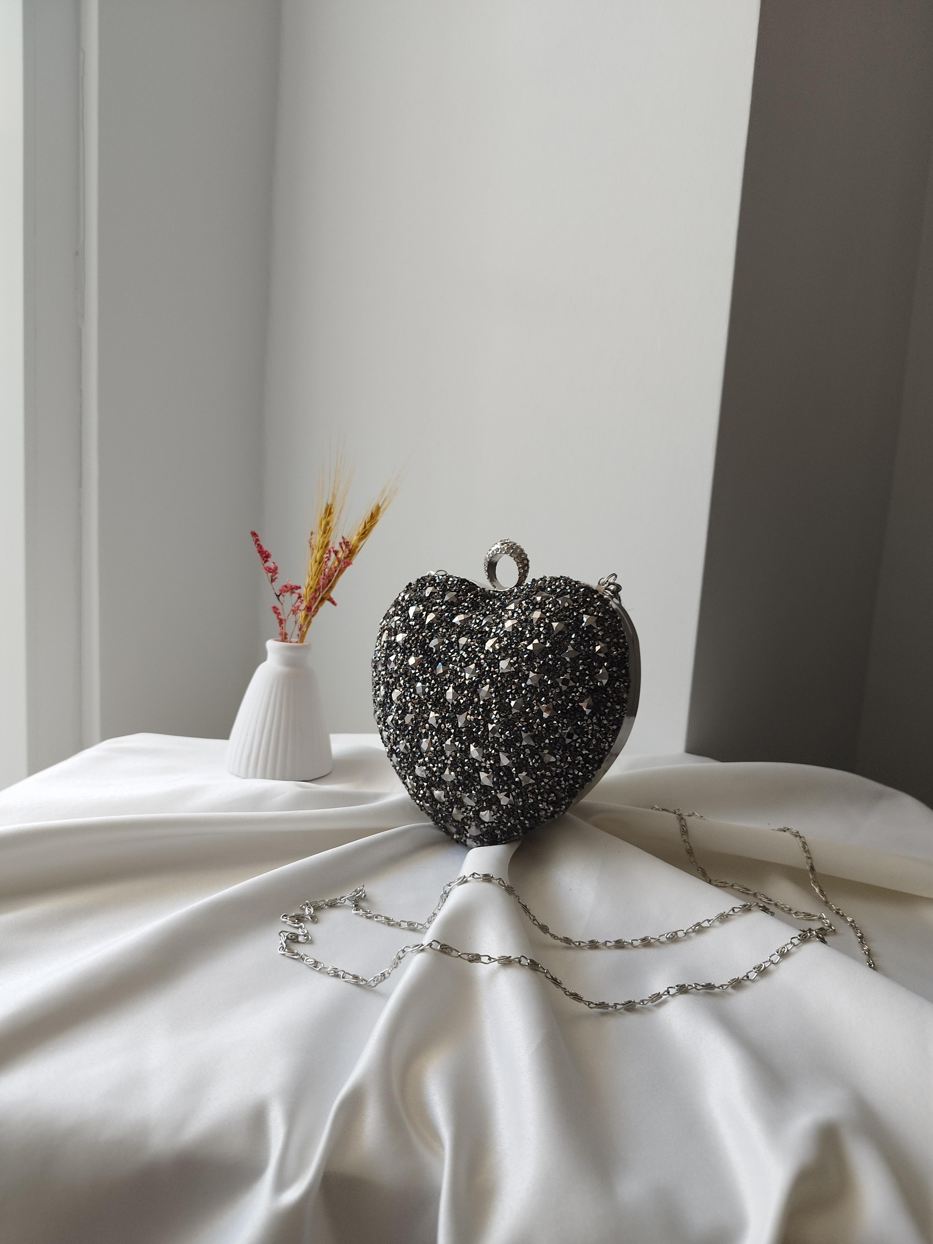 Kristal Taşlı Kalp Model Kadın Abiye Çanta Antrasit, antrasit rengi ve ışıltılı kristal taş detaylarıyla özel günlerde şıklığınızı ön plana çıkarır. Kompakt ve hafif tasarımı sayesinde telefon, makyaj malzemeleri ve küçük aksesuarlarınızı kolayca taşıyabilirsiniz. Kalp şeklindeki tasarım, düğün, nişan, mezuniyet, davet ve özel organizasyonlarda kombinlerinizi kusursuz tamamlar. El çantası olarak veya zincir askısıyla omuzda kullanıma uygundur.
